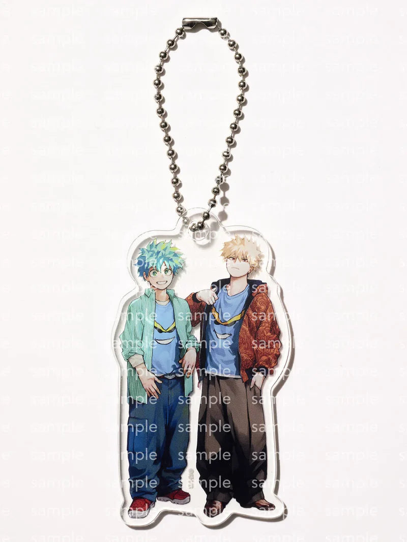 - Charm de acrílico con ilustraciones de Izuku Midoriya y Katsuki Bakugo dibujadas por Kohei Horikoshi