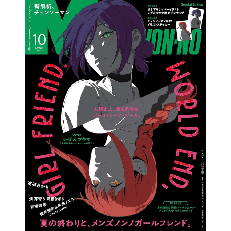[Portada de la Edición Especial] Ilustración original de anime de Reze y Makima (de la película "Chainsaw Man: Reze Arc"). Suplemento Especial 1: Pin-up de Reze y Makima de la ilustración de la portada. Suplemento Especial 2: Pegatina con la ilustración original de Chainsaw Man